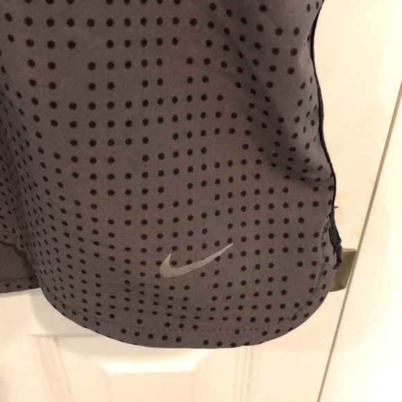 Cute gray and black NikeGolf Tour Performance Dr-Fit skort. Black polka dots on a warm gray/taupe background. Style is a short skirt over compression-type shorts. Front and back pockets, drawstring waist. There are a few marks on the back that didn’t come out when I washed it but they are hard to see, pictured. Size M