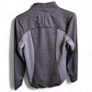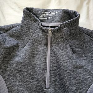 High-performance Nike Golf Tour Performance Dri-Fit pullover. Sleek athletic fit, heathered gray body with light gray contrast panels and round Swoosh zipper pull. Soft, stretchy, moisture-wicking knit ideal for golf or everyday activewear. Excellent condition, no holes or stains