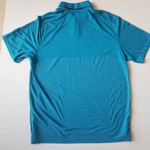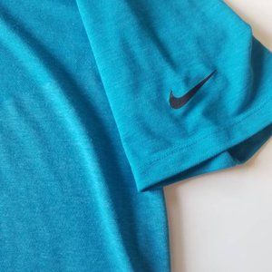 Nike Golf Tour Performance Dri-fit Mens Short Sleeve Polo. Color: Bondi Blue. Black Mesh Breathable Collar. Left Sleeve Black Logo. V Geometric Shape Two-toned with the Color of Bright Waters. Size: L Large. 90% Polyester/ 10% Cotton. EUC