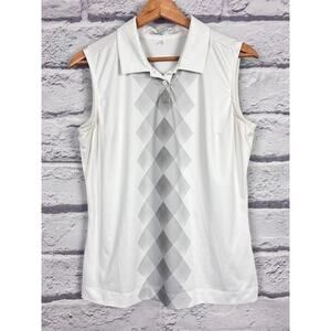 A stylish and functional sleeveless polo from Nike Golf, engineered with Dri-Fit technology to keep you cool and dry. This top features a modern grey argyle pattern on a textured white base, making it perfect for the golf course, tennis court, or any active day. The performance stretch fabric ensures maximum comfort and freedom of movement.