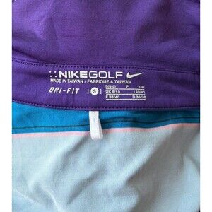 The Nike Golf Women's Purple Striped Silky Polo Shirt in size S is a stylish and functional piece of clothing designed specifically for golfing activities. Bust 18. The short sleeve, collared design provides both comfort and performance on the golf course. Made with a lightweight and breathable fabric, this polo shirt ensures you stay comfortable throughout your game. The Nike Golf product line focuses on quality and durability, making this shirt a reliable choice for any golfer looking for a stylish and practical option.