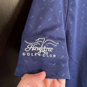 This shirt is made by Nike Golf. It’s a navy blue polo shirt with a swish on one sleeve and Hawktree Golf Club on the other sleeve. Men’s size large and in very nice pre owned condition. Smoke and pet free home.