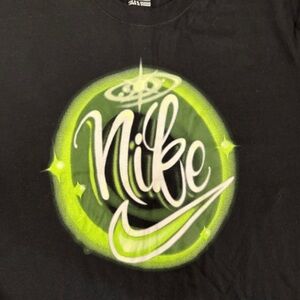 Nike graphic t-shirt in black with neon green design, size Medium. 100% cotton for comfort and breathability. Bold, streetwear-inspired style with classic Nike logo and vibrant neon accents.