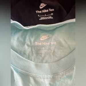 • Light Blue T-Shirt: Displays a sleek black Nike graphic logo.