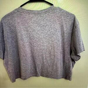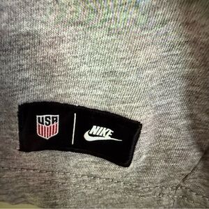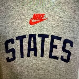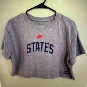 Stylish gray Nike crop top. Features bold blue 'STATES' lettering. Red Nike logo adds a pop of color.