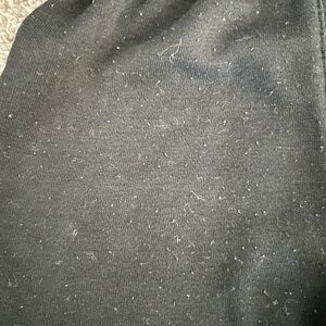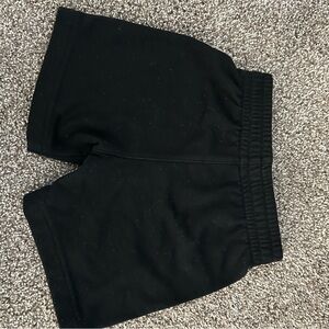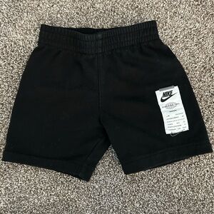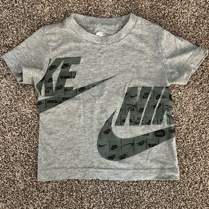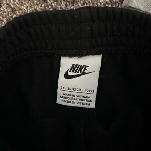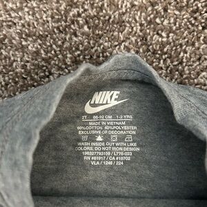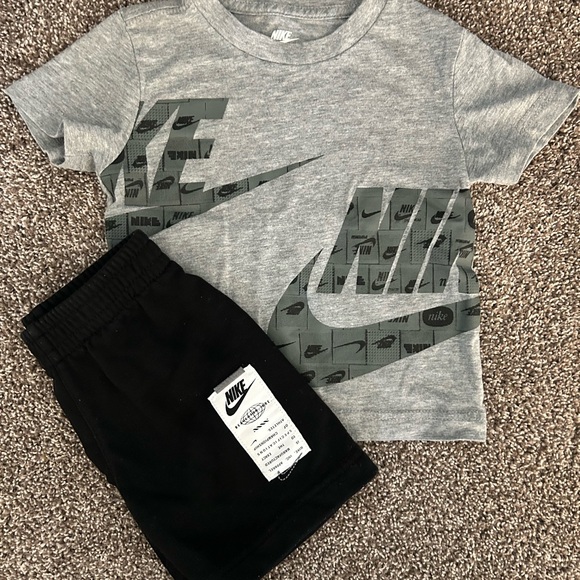 Nike set with a gray tee featuring bold graphics and black shorts. Cotton and polyester mix with sweat pants like shorts. Pilling on back and front shorts as pictured on last 2 slides.
