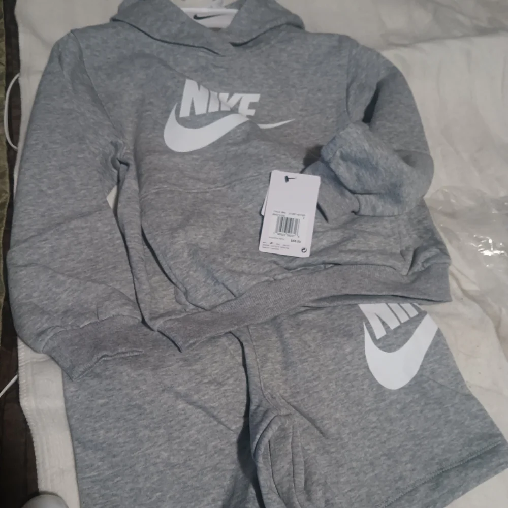 Cozy gray hoodie and shorts set. Features Nike logo. Perfect for casual wear.