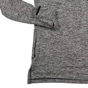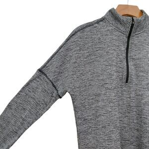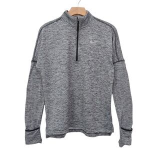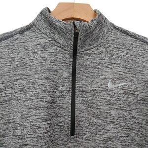 Comfortable gray quarter-zip sweatshirt. Features Nike logo. Ideal for casual wear.