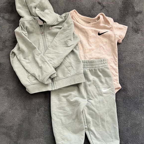 Stylish Nike tracksuit with hoodie and pants in gray. Includes a pink onesie with logo.