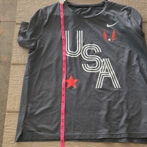 Gray Nike tee featuring bold USA graphic. Red star and accents. Perfect for casual wear.