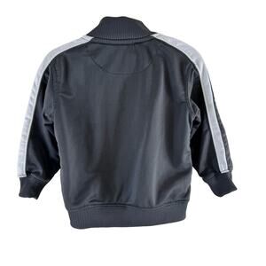 Excellent preowned condition. Gray lightweight full zip sweatshirt. Has white logo on left chest & white stripes down sleeves. Open pockets on lower front. Polyester material. Size 12 Months.