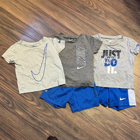 Three-piece Nike set with gray t-shirts and blue shorts. Ideal for active kids.