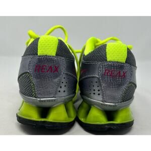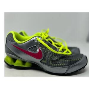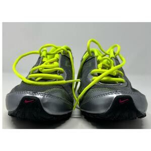 Stylish Nike sneakers with a vibrant design. Features gray mesh with neon green accents. Bold pink Nike swoosh on the side.