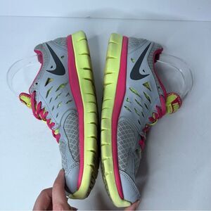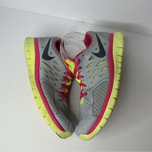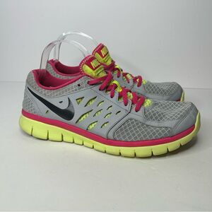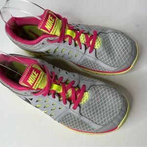 Step up your performance with Nike's athletic shoes, featuring a breathable mesh upper in a sleek gray with vibrant pink accents. The flexible sole ensures comfort and support, making them ideal for running or training sessions. Experience the perfect blend of style and functionality with these standout shoes.