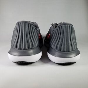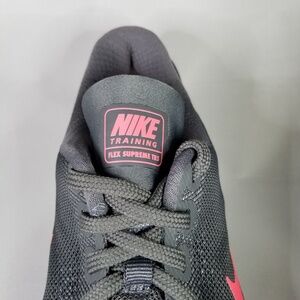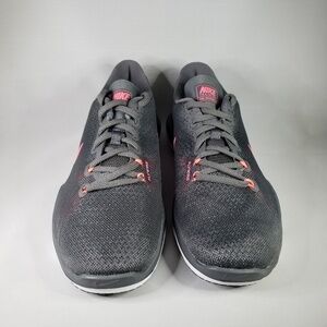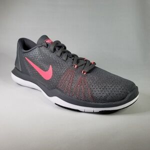 Stylish Nike athletic shoes. Gray mesh upper with pink accents. Comfortable and durable design. The bottoms of the shoes are stained from mud but will try and clean them the best I can before shipping.