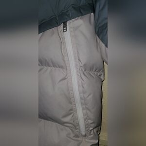 Stylish Men's Nike puffer jacket in gray and white. Features a hood, zip closure, and 2 zip pockets.
