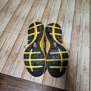 Stylish Nike sneakers with a gray upper and vibrant yellow highlights. Perfect for casual wear. Has some discolored spots on the rubber as shown in pics. great condition, great shoes. ladies size 6