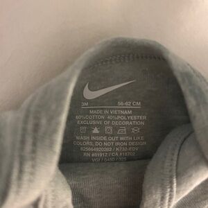 Adorable light blue/grey matching set. Nike logo. Long sleeves and pants. Some wear as pictured on logo and tiny stain on back of onesie