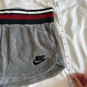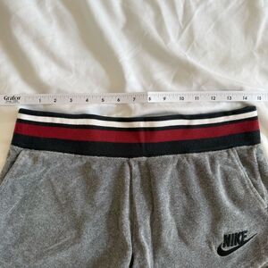 Stylish gray shorts with a bold red and black striped waistband. Ideal for sports or casual outings.