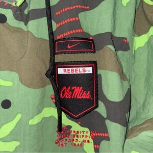 Nike jacket with green and brown camouflage pattern. Features red accents and Ole Miss branding.