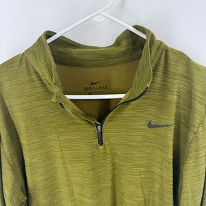 Experience comfort and style with this Nike long sleeve tee, featuring a sleek quarter-zip neckline. Crafted in a vibrant green and gold color palette, this shirt offers a relaxed fit perfect for everyday wear. Made from breathable performance fabric, it ensures you stay cool and comfortable throughout the day.