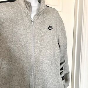 This heather, light gray, zip-up Nike sweater features a classic casual silhouette in a brushed, soft fleece and navy blue striped on the sleeves.. It also has 2 side pockets and a small Nike logo on the front.. Ribbed hem and cuffs provide a comfortable feel perfect for layering.Unisex. Sz.M
