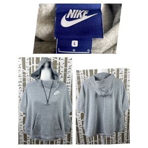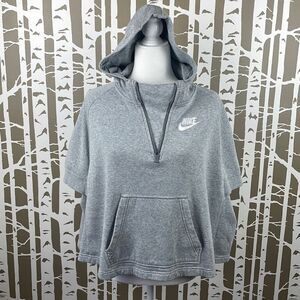 Nike Grey Girls Sweatshirt Hooded Poncho sz L. Features great sweatshirt fabric (52% cotton, 28% rayon, 20% polyester), white embroidered Nike logo on chest, fully functional zip accent on neckline, hood, front kangaroo pocket, loose fit through body. Gently worn and laundered with some light pilling but no flaws to note.