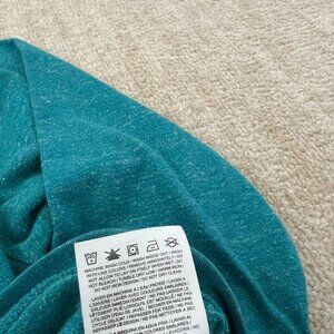 A blue / teal top with logo swoosh graphic. Fabric feels like either a lightweight sweatshirt or a heavier tee