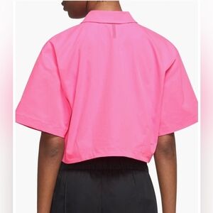 This vibrant pink top from Nike features a cropped, boxy silhouette with short sleeves and a classic polo collar and snaps, offering a modern and sporty look.