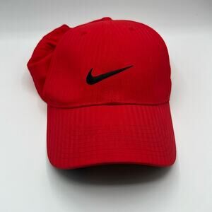 Gently Used Nike Dri-Fit Legacy91 Hat. Listed as a men’s but could be unisex, keep in mind it will be oversized. Mostly a true red color. Embroidered black Nike swoosh on the front. Adjustable strap back. 100% polyester.