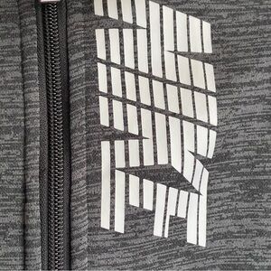 This Nike sweatshirt in a sleek gray hue features a full-length zipper and long sleeves, crafted from a comfortable heathered fabric. Ideal for casual wear, it includes a subtle graphic design element for added style.