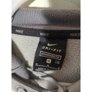 Stay cozy and comfortable with this Nike Dri-Fit Hoodie for men. The gray zebra striped pullover features a drawstring closure and mock neck neckline, with a front zipper pocket and logo accents for added style. The long-sleeved hoodie is made of polyester knit fabric that is machine washable, making it easy to maintain.