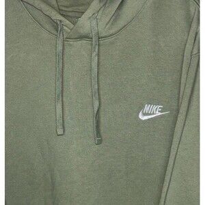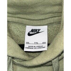 The Nike Hoodie for men in size XXL is a solid light green color with a drawstring closure and embroidered Nike logo accents. Made of a blend of polyester and cotton fleece fabric, this pullover hoodie is machine washable and features a hood, pockets, and is suitable for all seasons. With a regular fit and big & tall size type, this hoodie is perfect for various activities such as gym training, cross-training, and running. Ideal for sports enthusiasts, this Nike hoodie from the Sportswear product line is a stylish and comfortable addition to any man's activewear collection. 30 inches from pit to pit laid flat, 29 inches long.