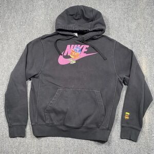 The Nike Hoodie Mens Small DN5180-010 Hamburger Graphic Swoosh Pullover Sweatshirt is a stylish and fun addition to any man's wardrobe. With a graphic print of a hamburger and Swoosh logo, this black hoodie is perfect for those who enjoy a quirky and retro style. Made from a blend of polyester and cotton fleece, it provides comfort and warmth, making it suitable for various activities like gym training, running, or skateboarding. Additionally, the drawstring closure, hood, and pockets add practical features to this pullover hoodie from Nike's Sportswear line.