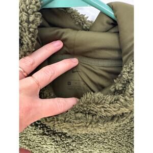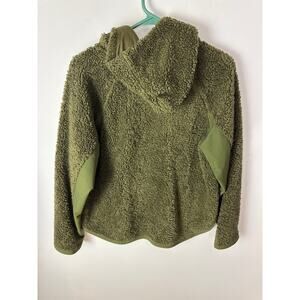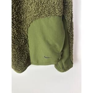 Gently Used Nike Sherpa Fleece Hoodie Sweatshirt. This is a women's medium. Darker green color throughout. Mostly a fluffy sherpa fleece, but there are some smooth spots on the front pockets. Nike swoosh logo by the front waist. Mesh interior lining. 100% polyester.