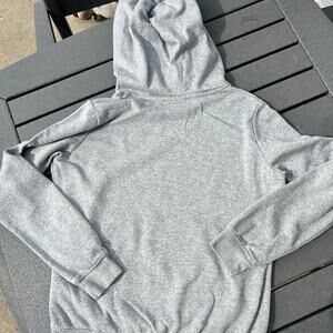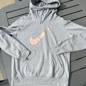 Nike M sweatshirt size M. Oversized collar makes drawstring hoodie. Gray with gold swoosh on front. Has single large pocket on front.