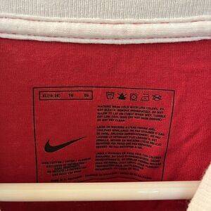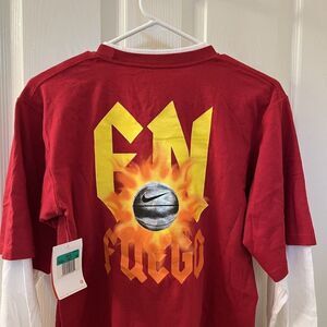 Nike Hoops En Fuego Basketball Layered Look Long Sleeve Top Boys Size XL 18-20. New With Tags. Red top made to look layered with attached white long sleeves. Nike Hoops graphic on the front with En Fuego, flames and a basketball graphic on the back. Tag indicates 2007. Style 219615. Such a great shirt.