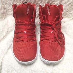 Red and white Nike hyperdunk basketball shoes. Brand new. Unisex- Men size 9.5/ 11 women and men 12.5/ 14 women. Make an offer.