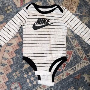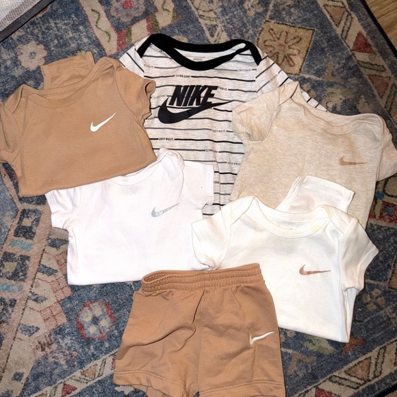 Charming Nike infant set with onesies and shorts. Features tan, white, and cream tones with signature Nike logo.