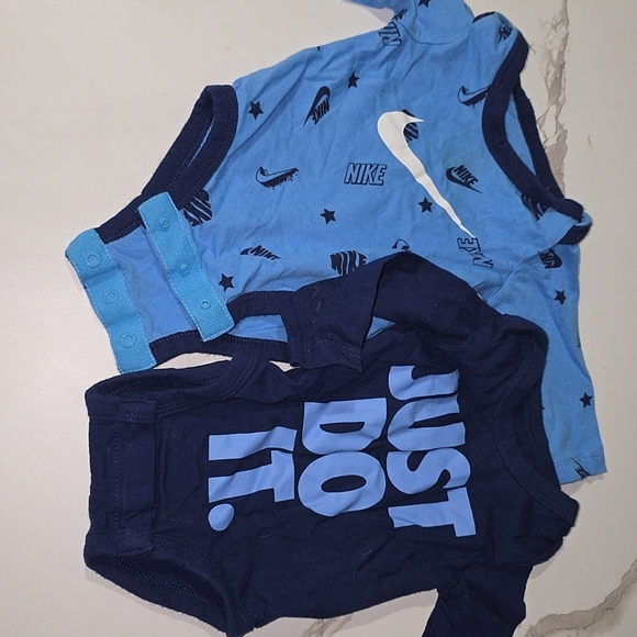 Set of two Nike infant bodysuits. Light blue with logo patterns and dark blue with 'Just Do It' print.