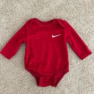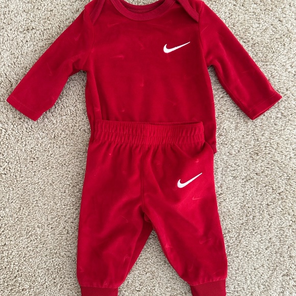 Soft and warm red tracksuit for infants. Features Nike logo. Includes top and pants. Worn once and washed per instructions. This is so cute, my baby was born big and unfortunately was too big for it by the time we bought it.