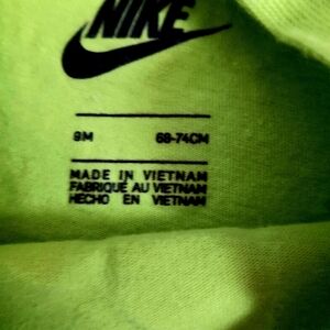 Pair of Nike infant rompers. Lime romper with bold logo. Navy romper with 'Just Do It' slogan.
