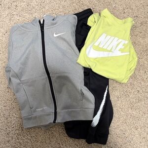 Charming Nike infant set with teal top, pants, and hat. Features 'Just Do It' and 'Nike' logos in yellow and white.
