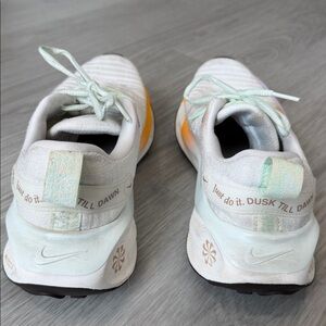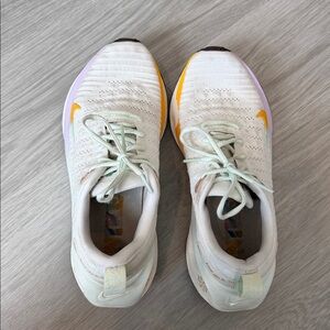 Nike running shoes in white with vibrant orange swoosh. Lightweight and comfortable design.