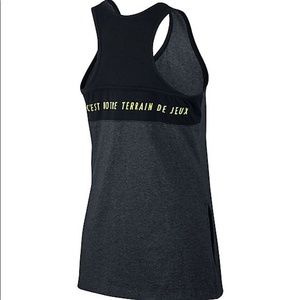 Nike International Tank Top Size Large, New with Tag Racerback design allows unrestricted movement High vented hem for a greater movement and comfort Reflective details adds Safety Comfortable 100% Cotton Dark Heather Gray with Black Trim Measures 19" Between underarm seams 29" Length from top shoulder seam to bottom hem B19/13