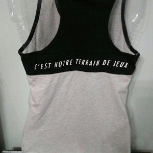 Nike International tank top - size Small. Light gray with black trim and side splits. French saying on back "This is our playground". Approximately 25-26 inches in length.