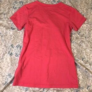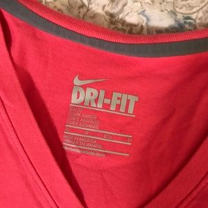 Cute and bright Nike work out tee shirt! Bright pink color with a neon green/yellow script "It's Not The Shoes" with swoosh logo print across the front. V neckline and short sleeves. Worn only a few times, in great condition!