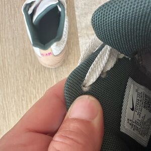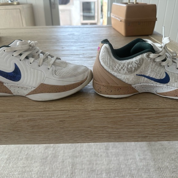 Stylish Nike sneakers featuring a white and tan design with a striking blue swoosh. Perfect for casual wear.