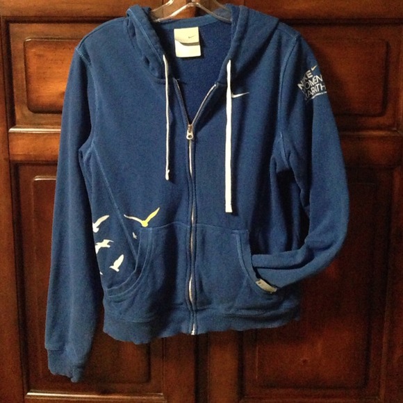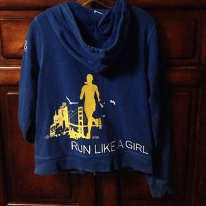 Blue nike women's marathon jacket. Has yellow for an accent color and the powerful phrase "RUN LIKE A GIRL" on the back. A size large, but fits more like a medium.