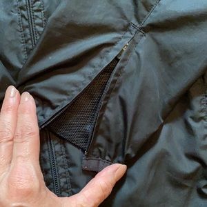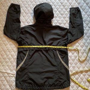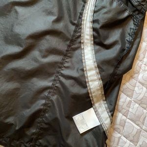 Nike Black with gray reflexive stripes nylon jacket. Has a removable hood, zipper pockets and sleeves, vented flap in the back for circulation.
